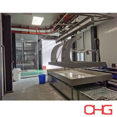 Deze productielijn is gespecialiseerd in het aanbrengen van glazen smeermiddelen op smeedstukken van verschillende vormen, met materialen zoals titaniumlegeringen, hogetemperatuurlegeringen en hoogwaardige staalsoorten. Het spuitproces integreert zowel geautomatiseerd spuiten als aanvullende handmatige coating om een volledige dekking te garanderen. Het gebruikte transportsysteem is een heavy-duty accumulatietype, ontworpen voor werkstukken met een gewicht tot 2 ton.